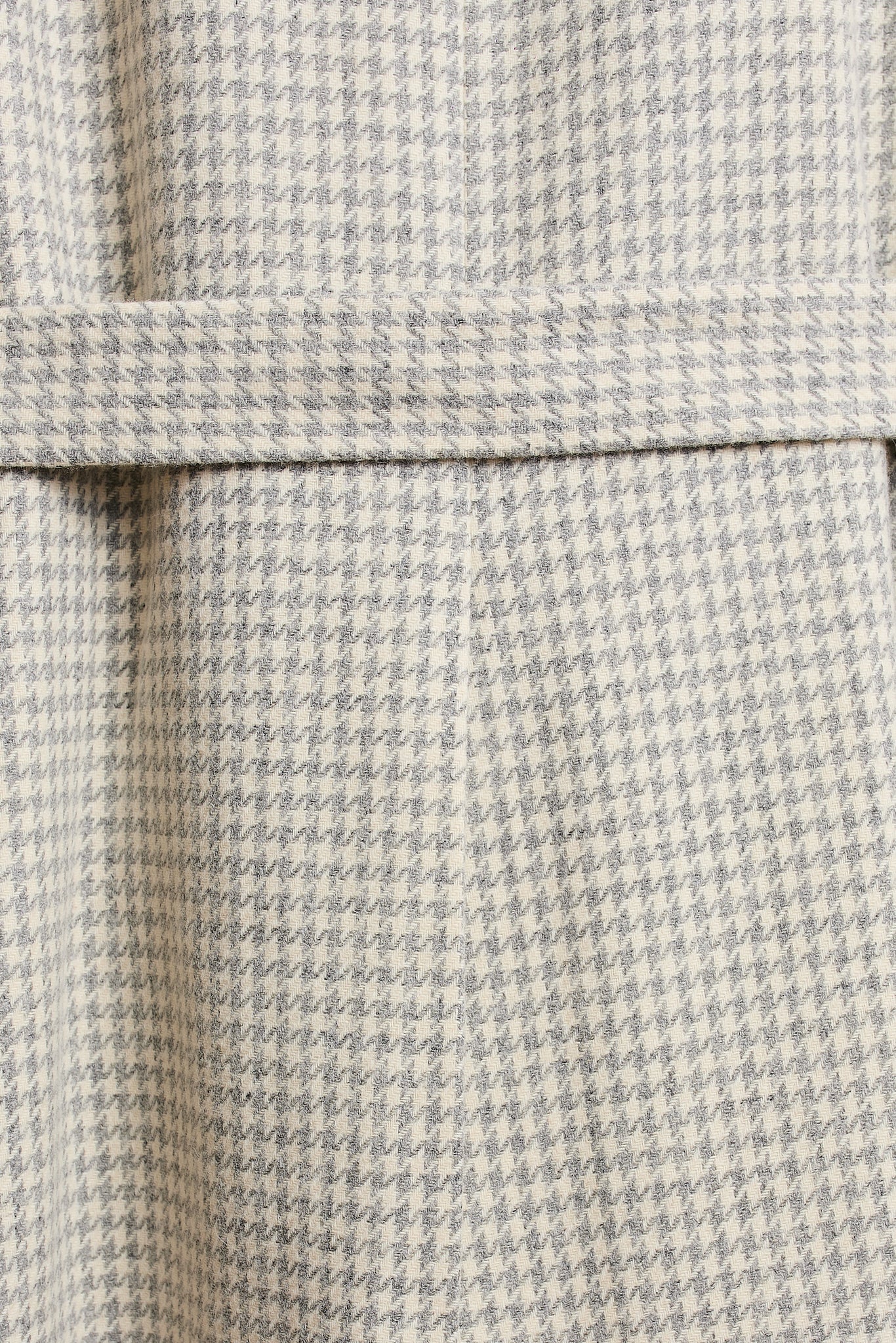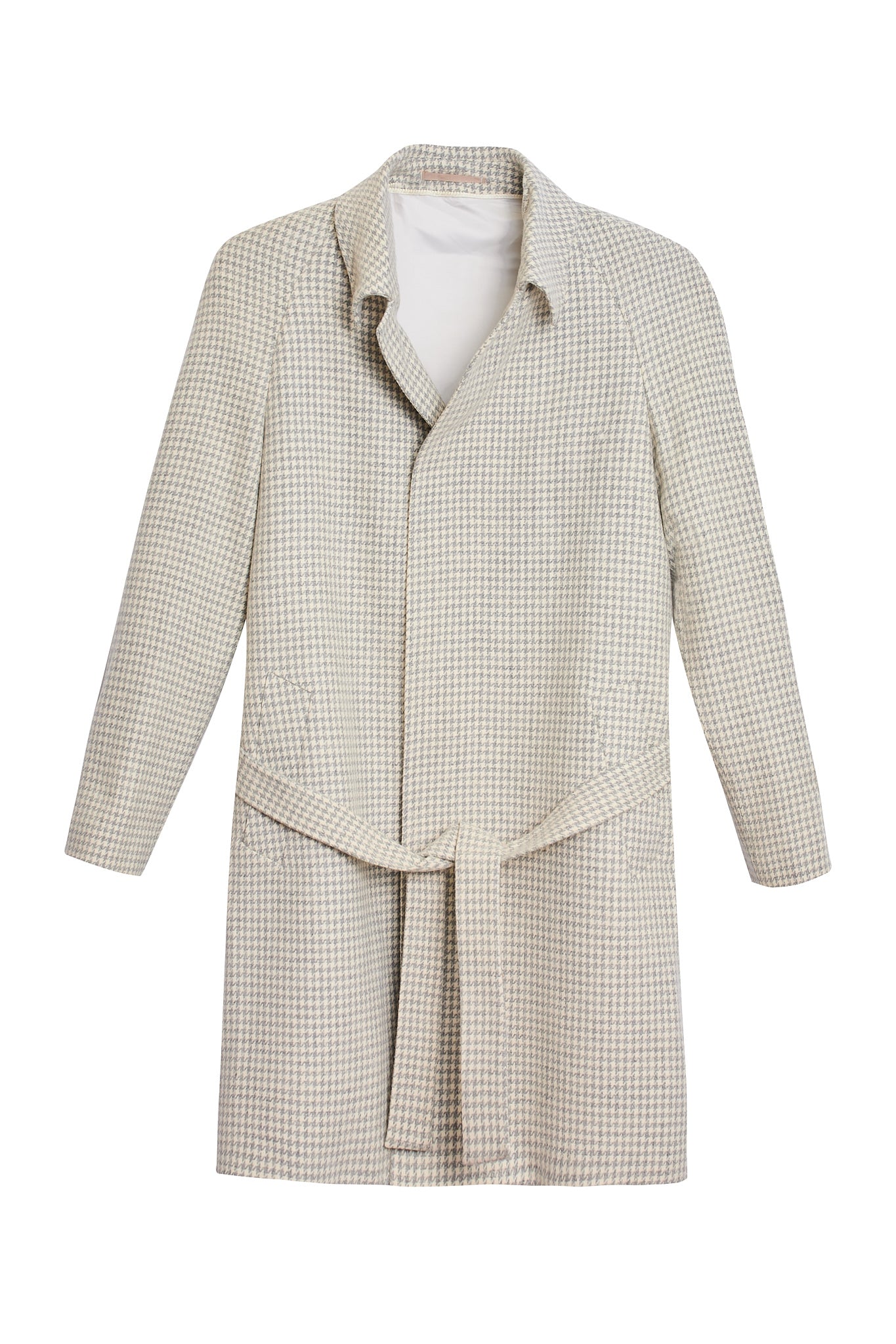 Abrigo con manga ranglán y cinturón ajustable confeccionado en lana en crema y gris.