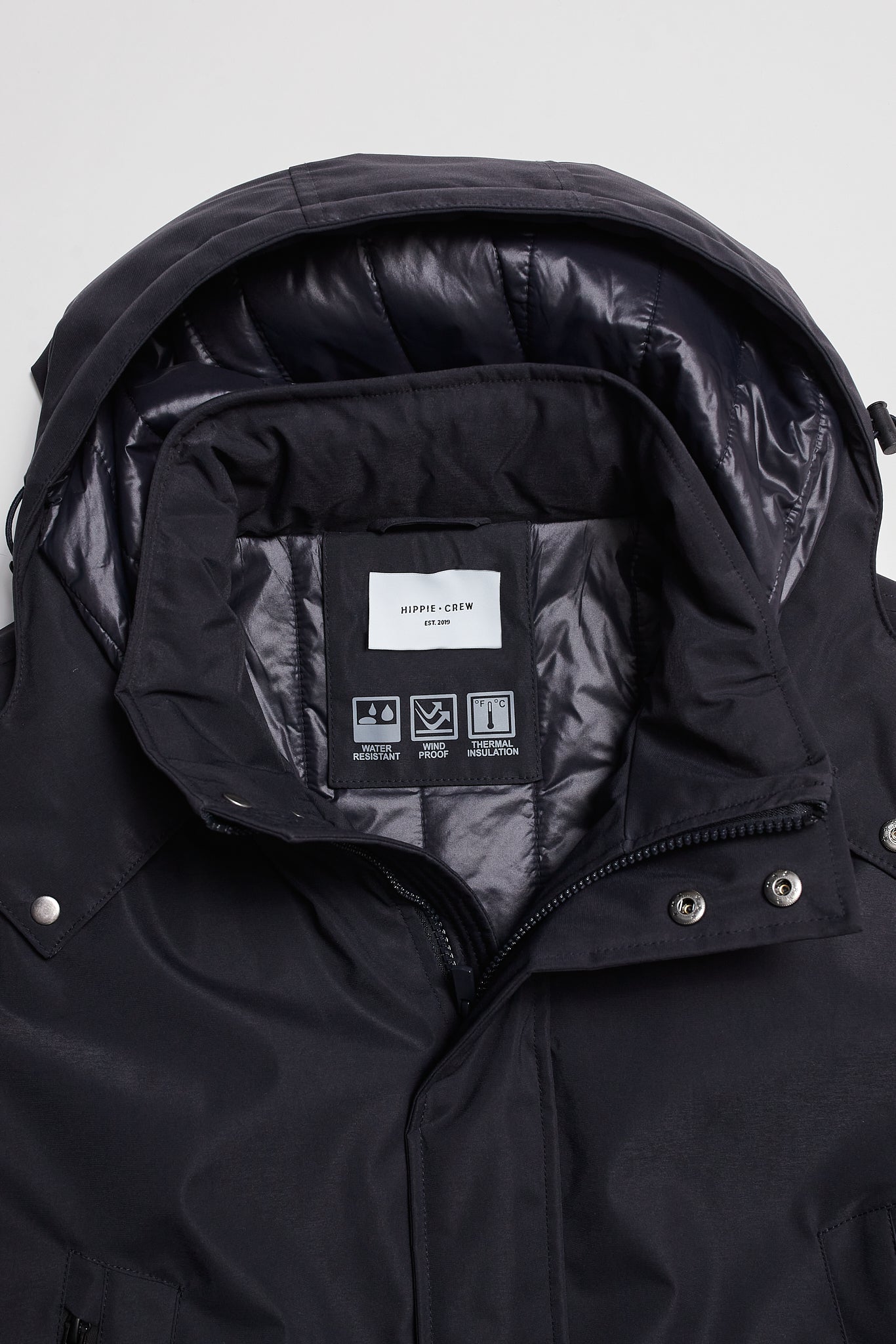 Abrigo tipo parka confeccionada en tejido técnico 100% poliéster reciclado repelente al agua. Esta está acolchada con poliéster reciclado que garantiza una termorregulación natural, aislando del viento y de altas temperaturas.