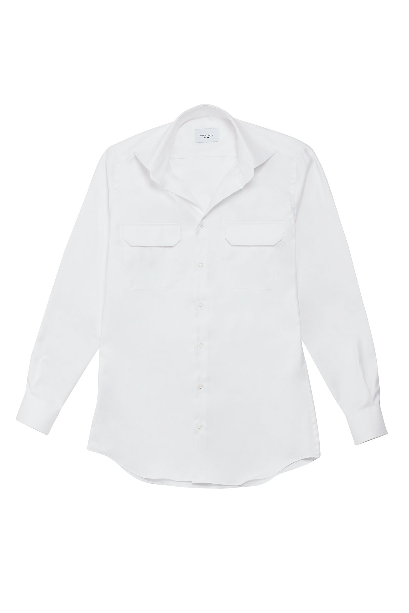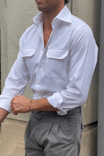 Camisa confeccionada en algodón travel de fácil plancha color blanca. Presenta cuello italiano con pala de 8,5cm y bolsillos en el pecho.