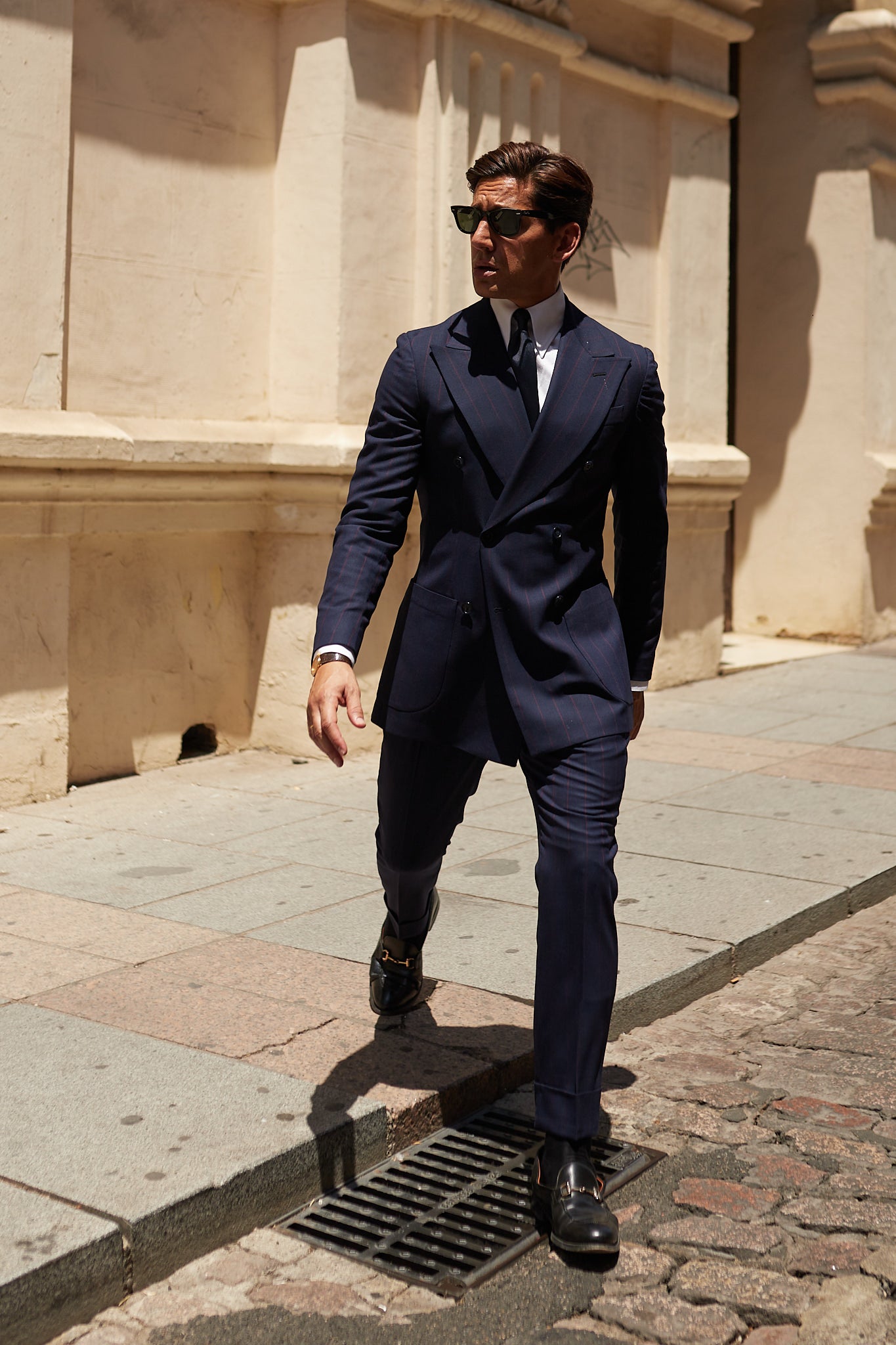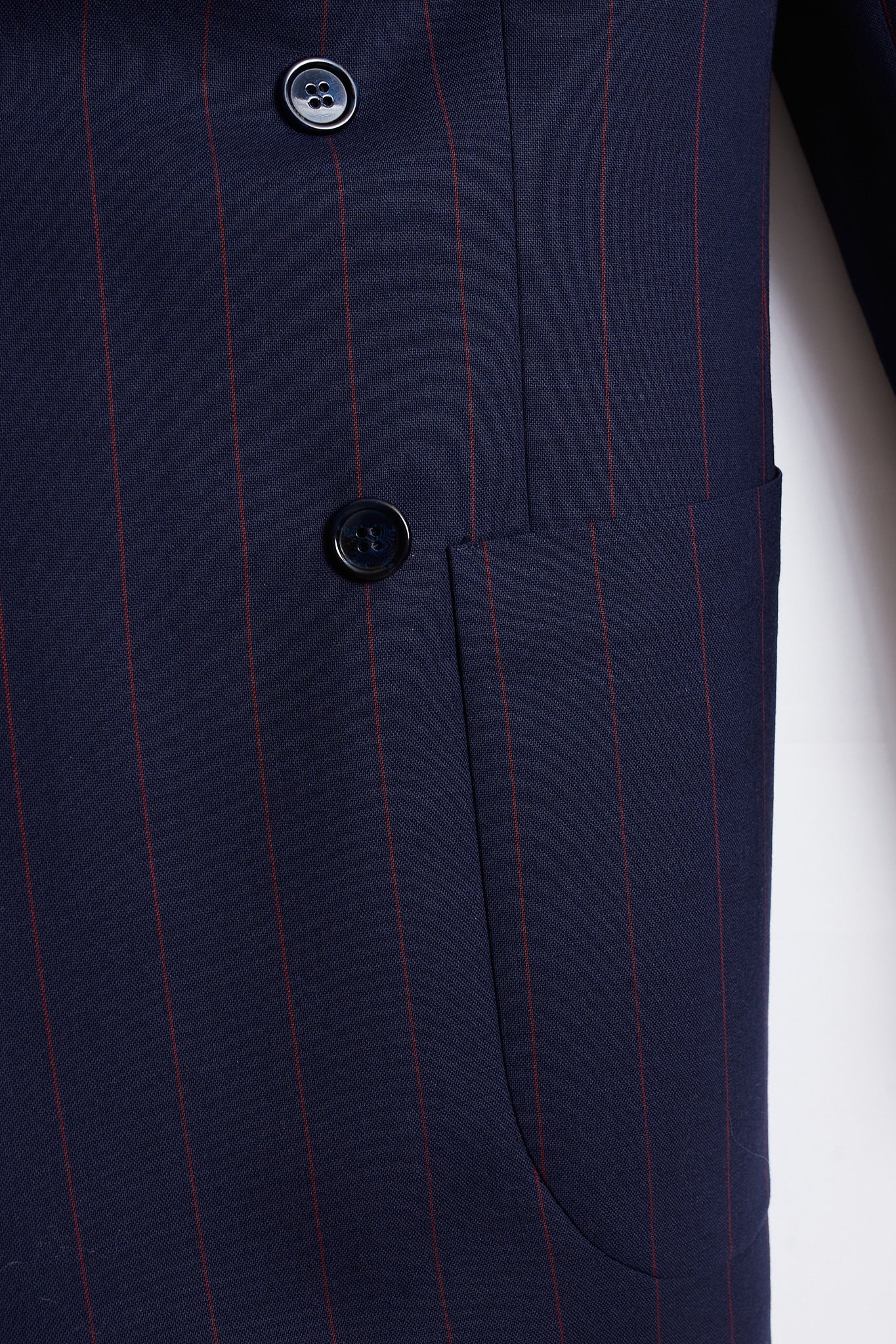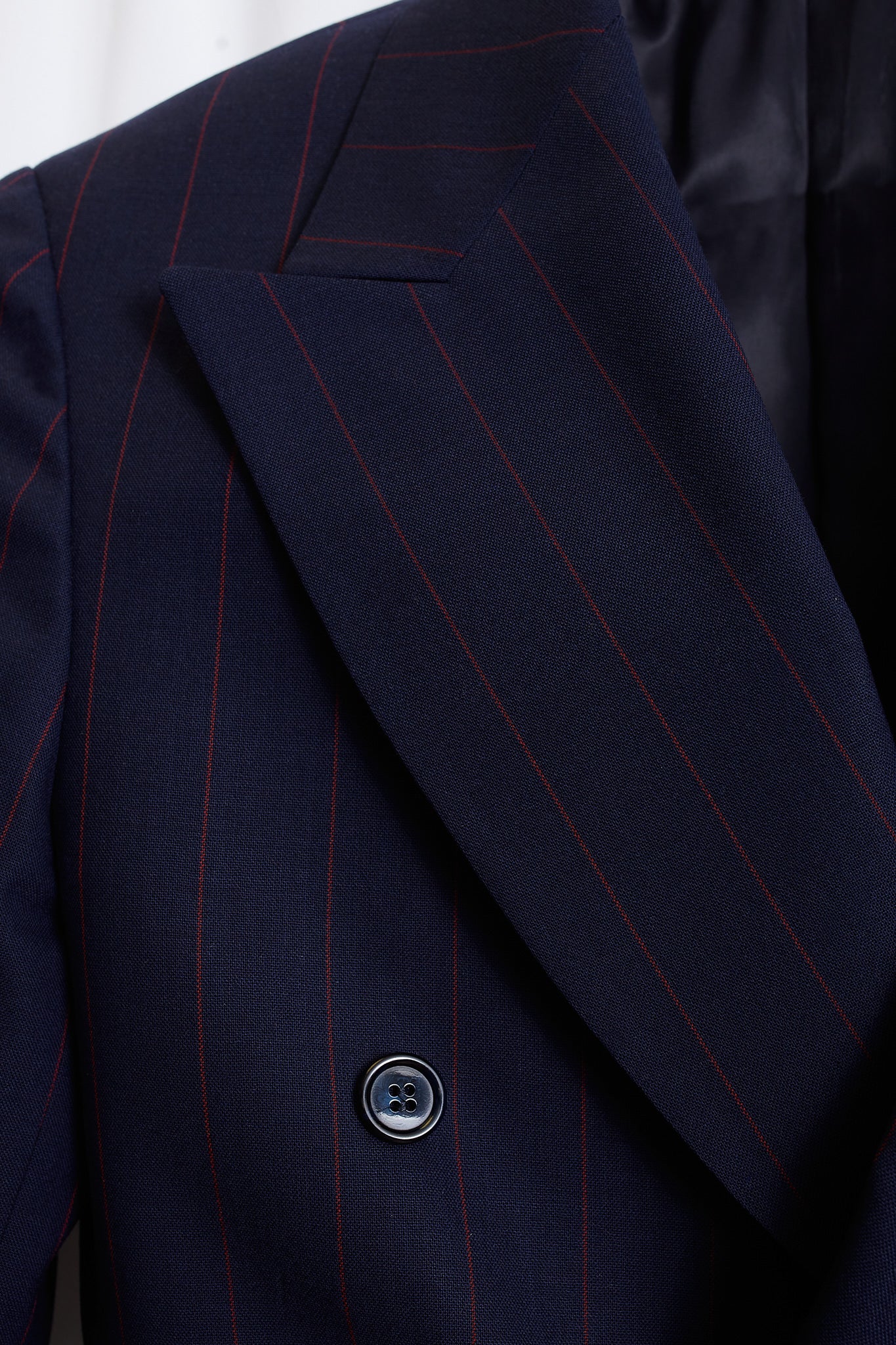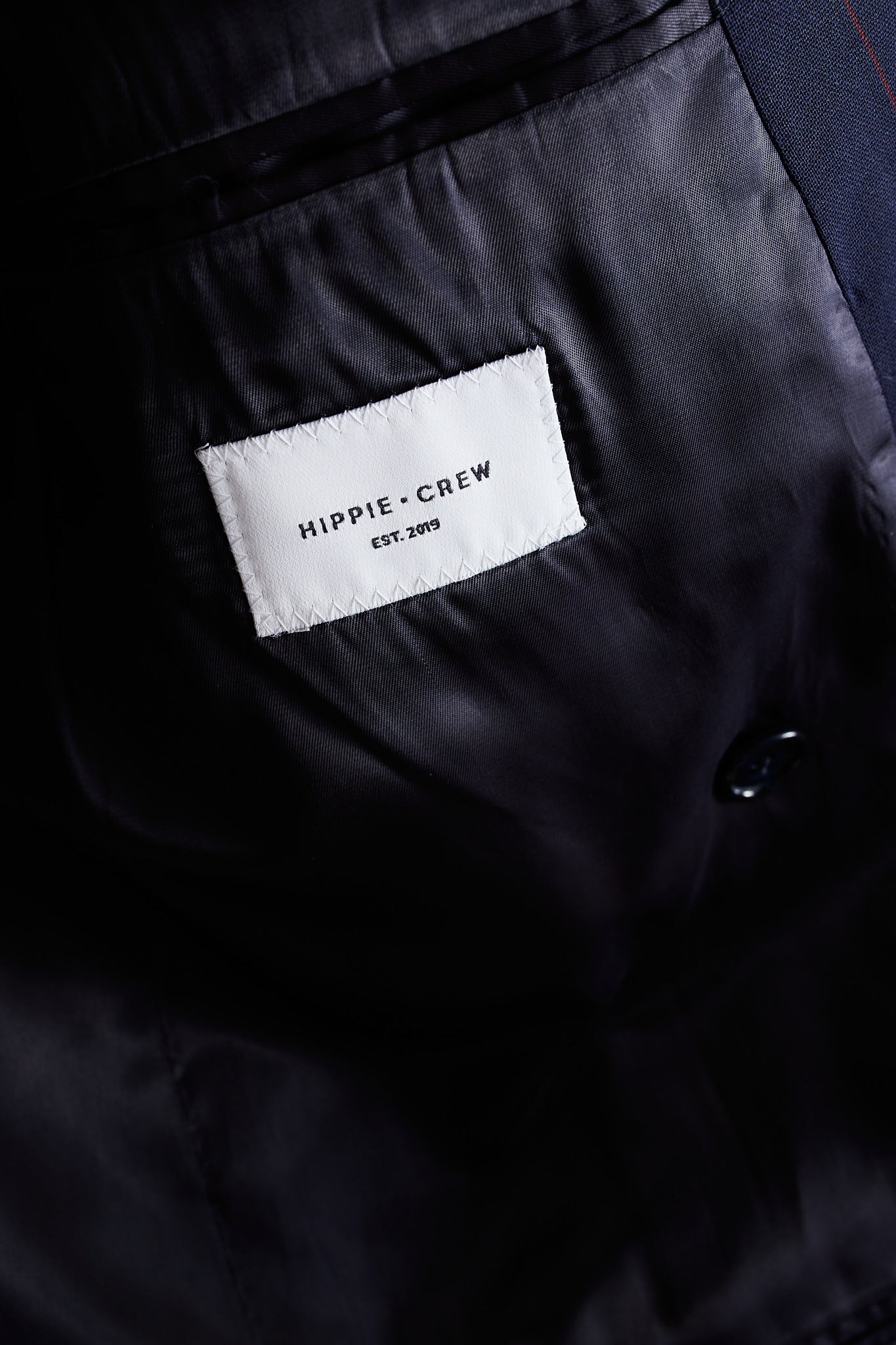 Americana cruzada de traje confeccionada con un patrón desarrollado por Hippie Crew. Color azul marino con raya diplomática en tono burdeos.