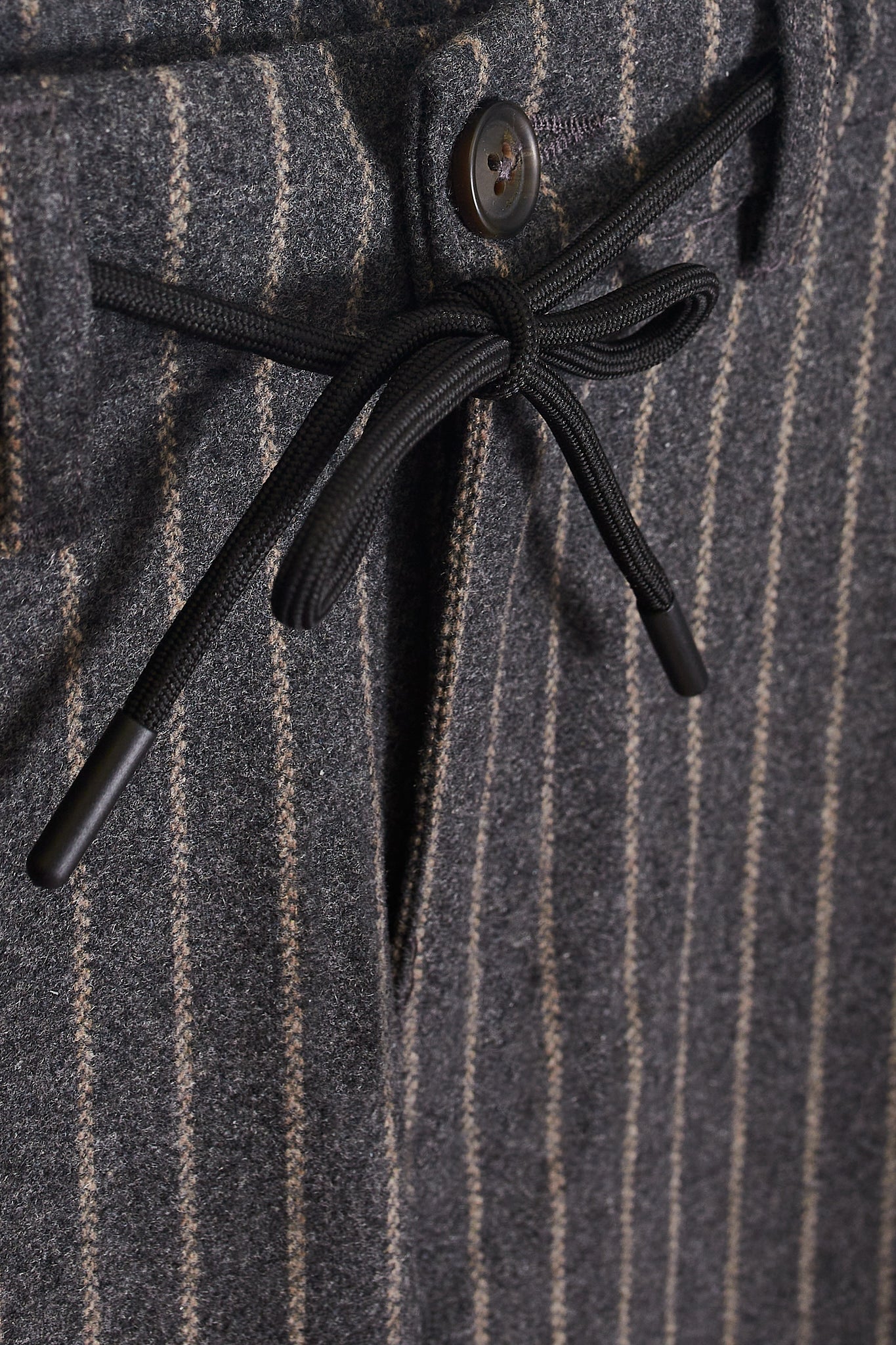 Pantalón tipo cargo confeccionado con tejido lana tipo franela en color gris mafengo con rayas beige. La versión elevada de nuestro pantalón cargo. Presenta cintura elástica con cordón y bolsillos laterales. Un tejido y detalles tailoring para una prenda casual.